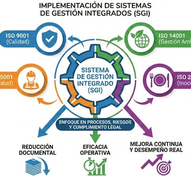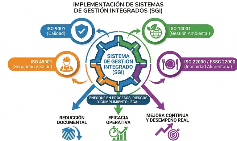 Ofrecemos la implementación de Sistemas de Gestión Integrados (SGI) que articulan de manera coherente y eficiente los requisitos de ISO 9001 (Calidad), ISO 14001 (Gestión Ambiental), ISO 45001 (Seguridad y Salud en el Trabajo) e ISO 22000 / FSSC 22000 (Inocuidad Alimentaria), bajo un enfoque basado en procesos, riesgos y cumplimiento legal.